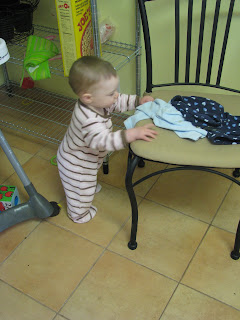 She is standing up on everything and anything and walking everywhere (while supported, of course). She is getting brave and letting go every once in a while, and is genuinely surprised when she topples over. She tries to stand up in the middle of a room sometimes, but the result is more downward dog than anything else. We are amazed by her curiosity and how quickly she can get herself into a place she isn't supposed to be. Her new favorite toy is the toilet--she pulls up on it and then tries to lick the top of the seat (don't worry, lid down!) It is a little cute, and a lot gross.