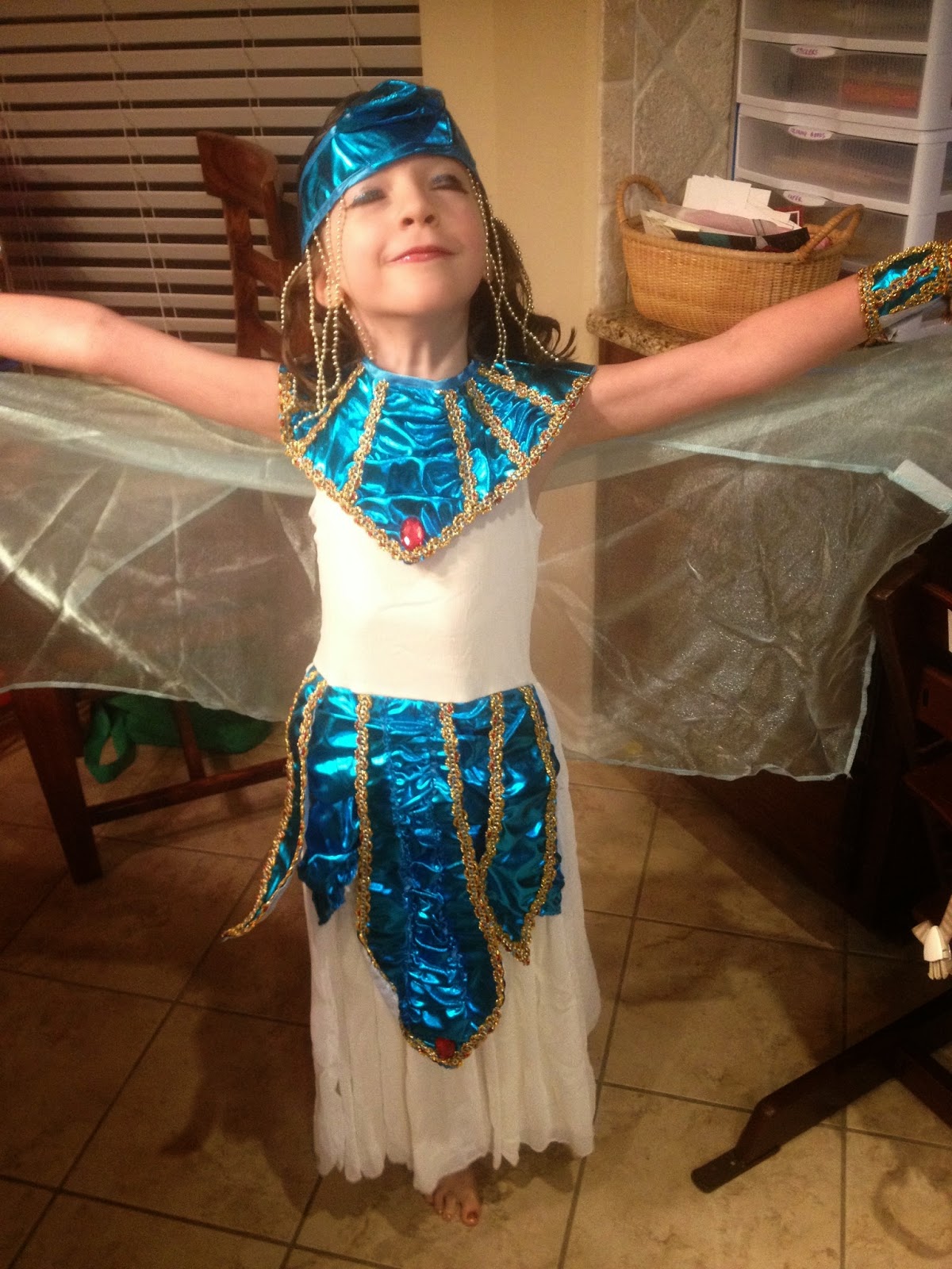 Norah's school does not let the kids dress up for "Halloween," instead they have a theme and the kids can dress according to the theme. Last year was a character from a book. This year was "Blast from the Past." For whatever reason, Norah decided she wanted to be Cleopatra. In piecing her costume together from stuff around the house we decided to get a black wig. One trip to Party City and we left with this bad boy (but no wig).